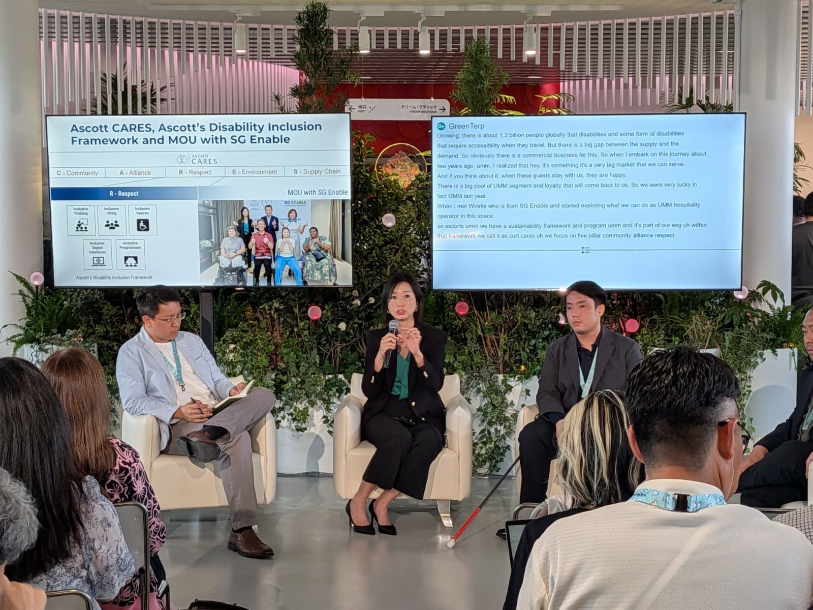 Ms Beh Siew Kim, Ascott’s Chief Financial & Sustainability Officer (middle) sharing how disability inclusion is integral to Ascott’s sustainability framework, Ascott CARES at the Singapore Pavilion during World Expo 2025 in Osaka, Japan.