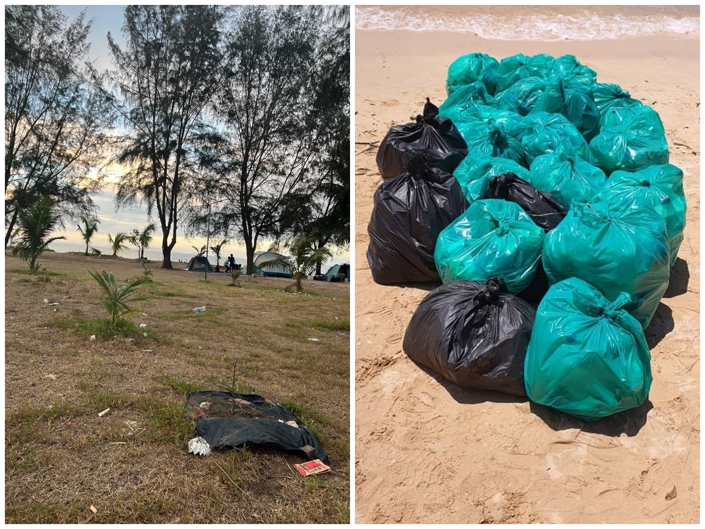 The beach condition before cleanup (left) and the total rubbish collected (right)—out of 50 bags, 30 were recyclable