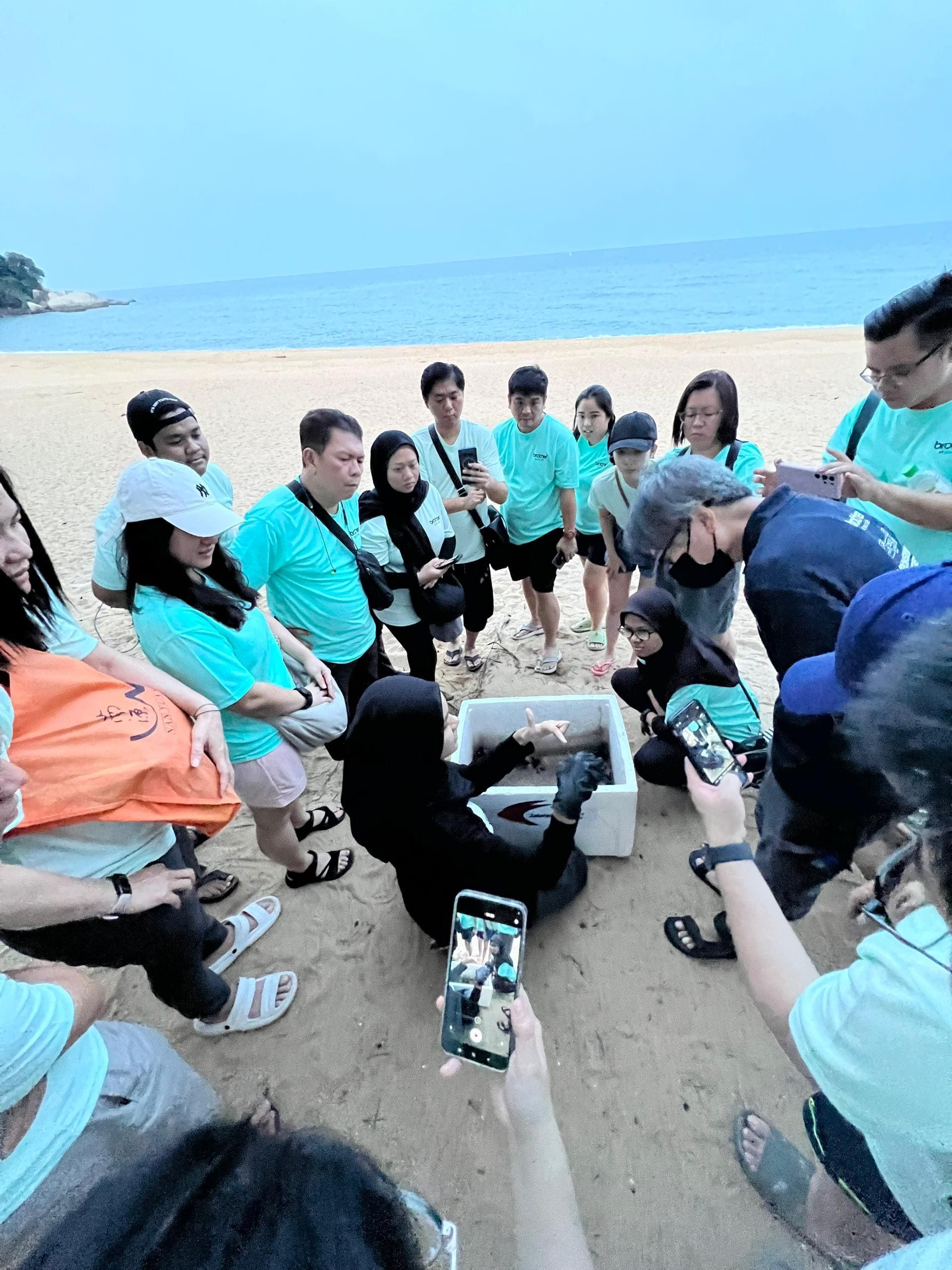 Participants engaged in a hands-on educational session at the Ma’Daerah Turtle Sanctuary, observing the delicate process of releasing baby turtles back into the ocean