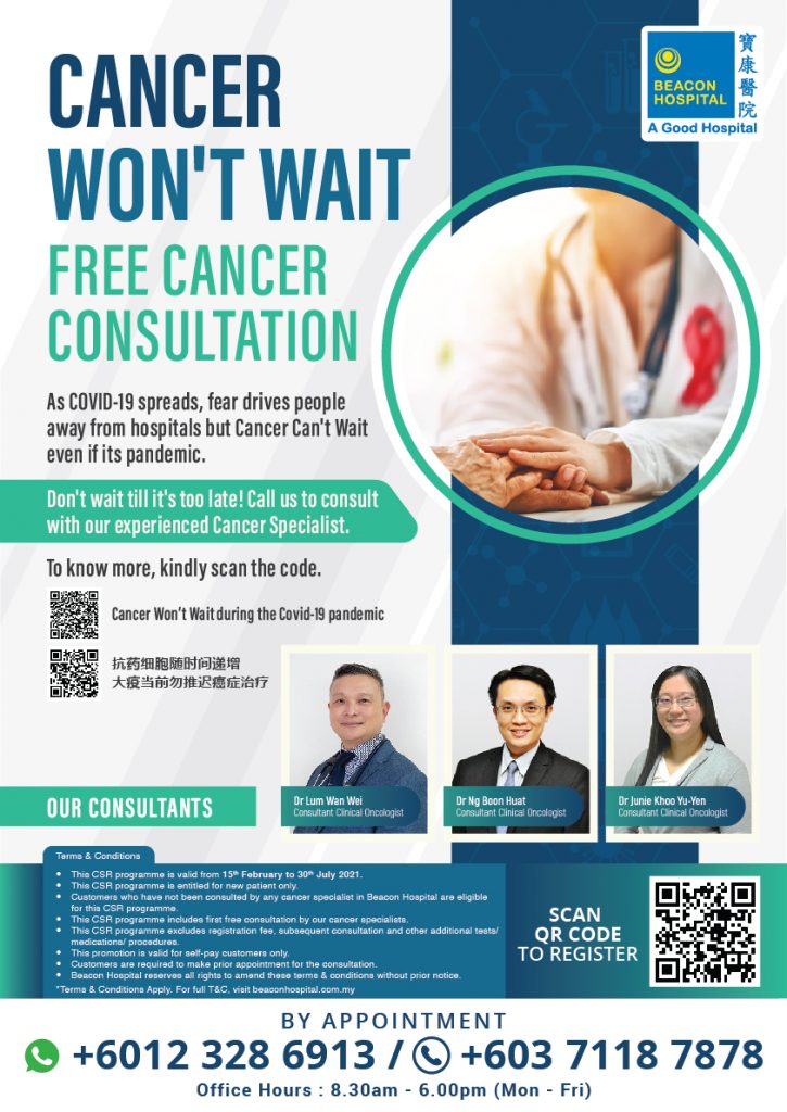 “We are currently facing stressful and challenging times with the current COVID-19 pandemic. Yet it is crucial to know that the long intervals between cancer detections, diagnosis and treatment, could result in disease progression or treatment complications,” says Dato’ Dr Mohamed Ibrahim Bin Dato’ Hj. Abdul Wahid, Consultant Clinical Oncologist & Medical Director of Beacon Hospital. “It is vitally important that you don’t delay cancer treatments and our experienced team of multidisciplinary specialists are here to support you,” he added.