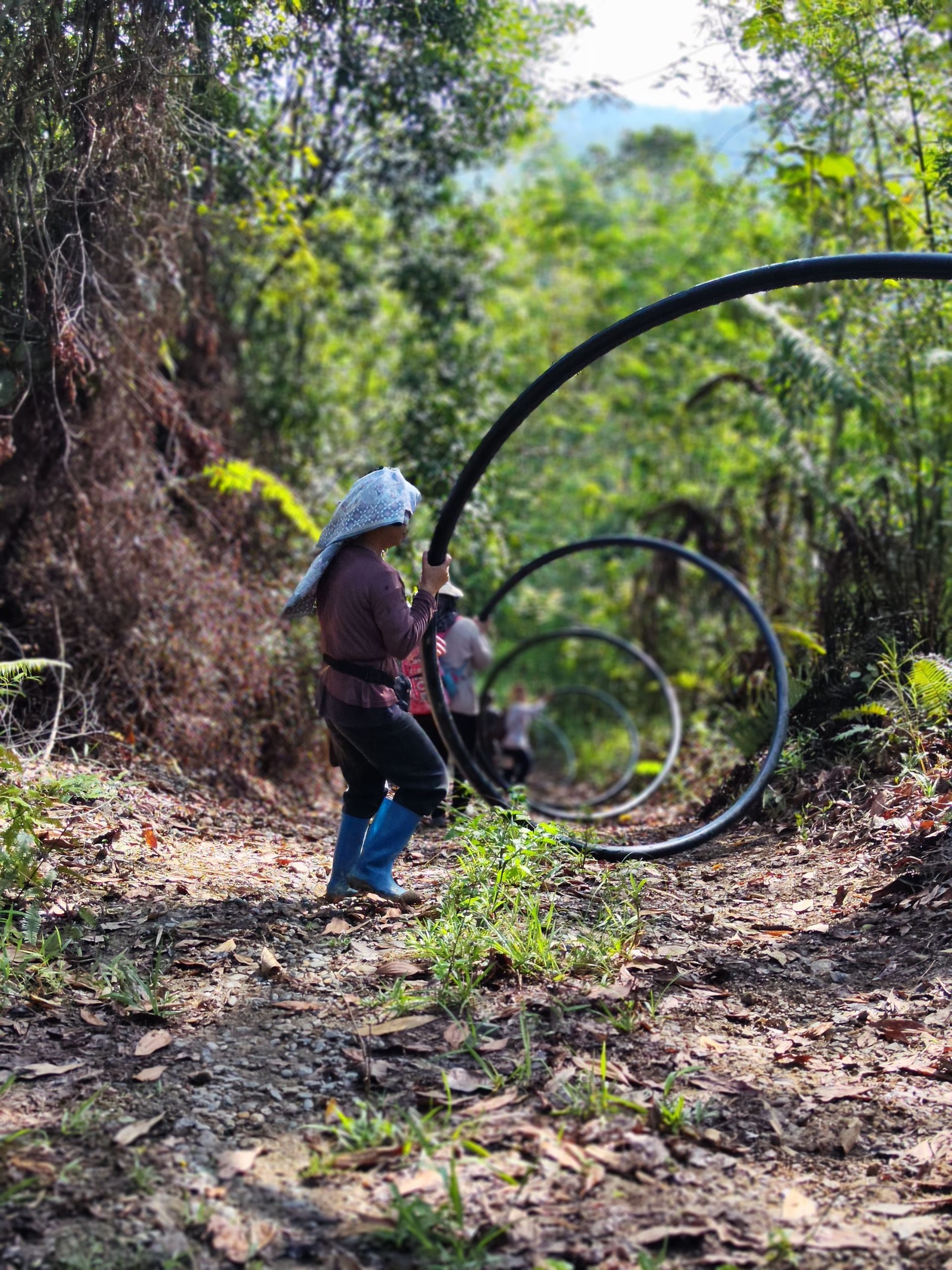 A group of villagers unravelling a roll of polypiping in the jungle