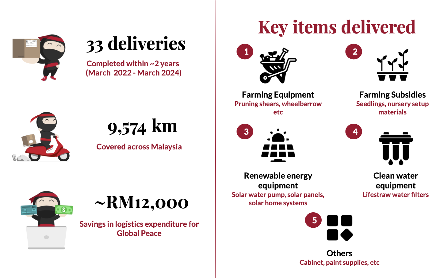 “Our partnership with Global Peace underscores our commitment to making a meaningful social impact. Our logistics capabilities have enabled us to serve even the most remote areas effectively. Since the start of our collaboration in 2022, we have completed 19 deliveries spanning over 5,000 kilometers, demonstrating our ability to deliver real value. We are excited to continue this journey and explore further opportunities to support the OA community,” said Fairul Hidayah Jaffar, Head of Quality Assurance, Health and Safety, and Environment at Ninja Van Malaysia.