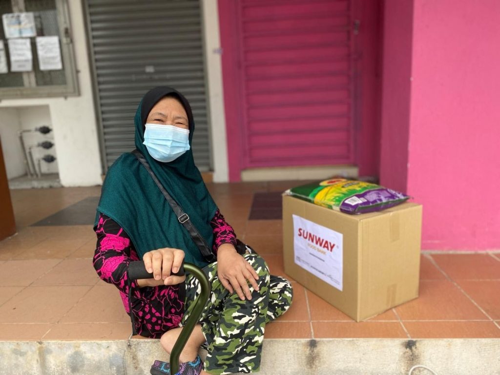 (#SunwayforGood Food Bank delivering aid to a recipient at PPR Desa Mentari / Sunway Group)