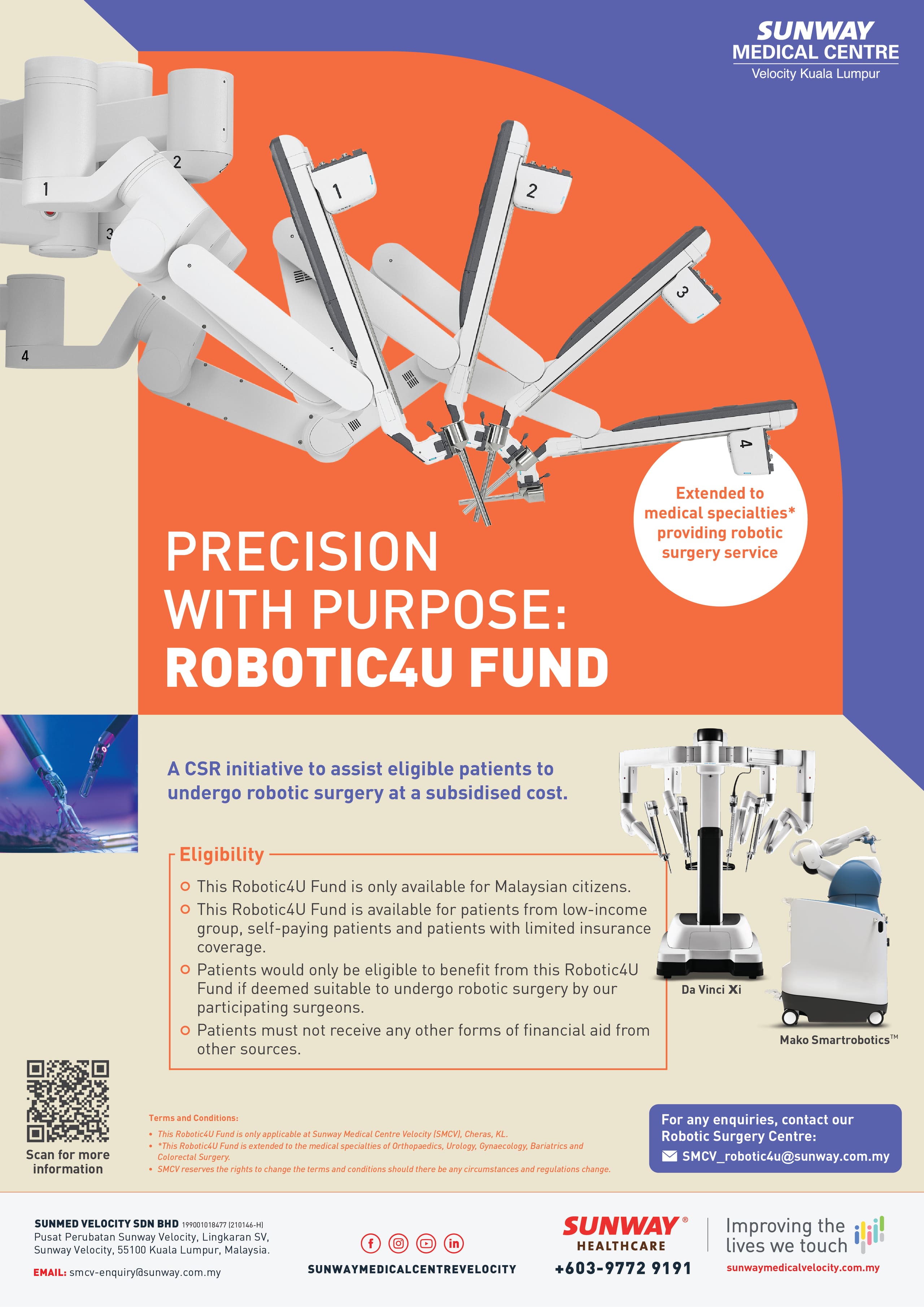 Ms Susan Cheow, Chief Executive Officer (CEO) of SMCV, expresses her enthusiasm, stating, “Since the introduction of our Robotic Surgery Service in last year, together with the establishment of the Robotic4U Fund, SMCV has made significant strides towards our vision of providing advanced healthcare solutions that are accessible to all. We believe that cost should not be a barrier to healthcare, as every patient deserves the right to a better quality of life. This initiative continues to redefine patient care in Malaysia, ensuring that cutting-edge medical treatments are within reach for everyone.”