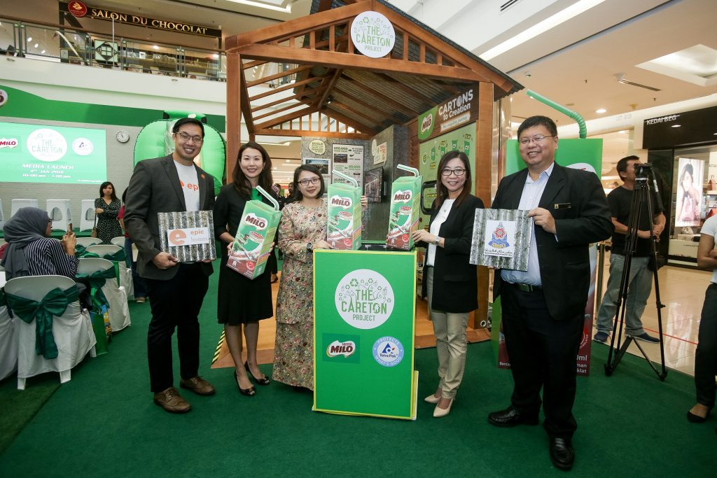 - (From left) John-Son Oei, founder of EPIC Homes; Ng Su Yen, Business Executive Officer for Nestlé Ready-to-Drink, Nestlé (Malaysia) Berhad; YB Jamaliah Jamaluddin, ADUN Bandar Utama; Terrynz Tan, Director of Communication and Environment, Tetra Pak Malaysia, Singapore & Philippines and Lee Lih Shyan, Director of Solid Waste Management and Public Cleanliness Department MBPJ during the launch of the CAREton Project 2019