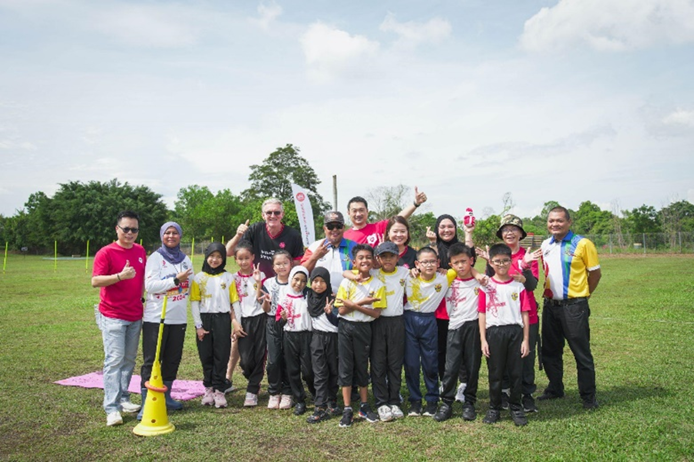 Tune Protect volunteers alongside teachers and students of SK Kg Baru Si Rusa during the Kids Athletic Carnival