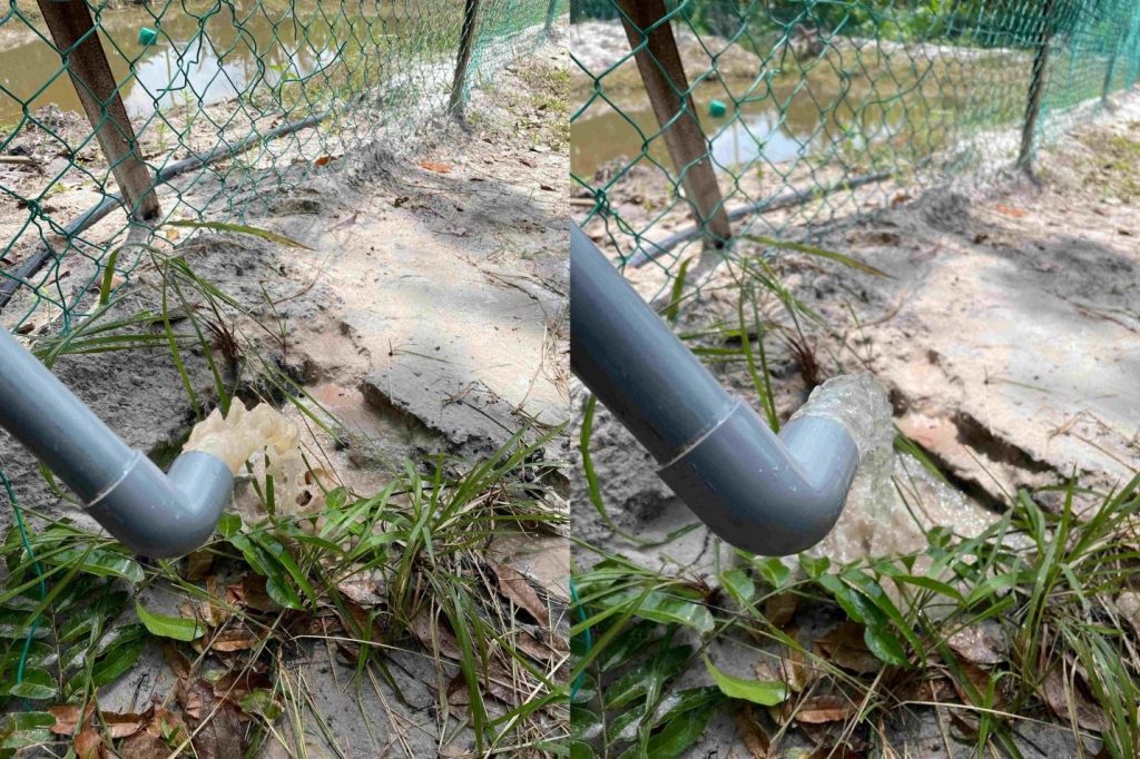 (Before and after – Crystal clear water flowing through the pipe after the installation of Waterco’s water filter at the main water source of Kampung Teraling.)