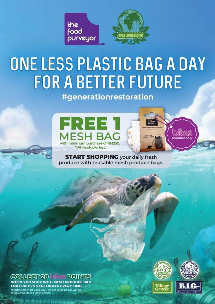 (Under the campaign, shoppers who spend more than RM250 at the supermarkets can redeem (via BITES app) a reusable mesh produce bag for groceries.)